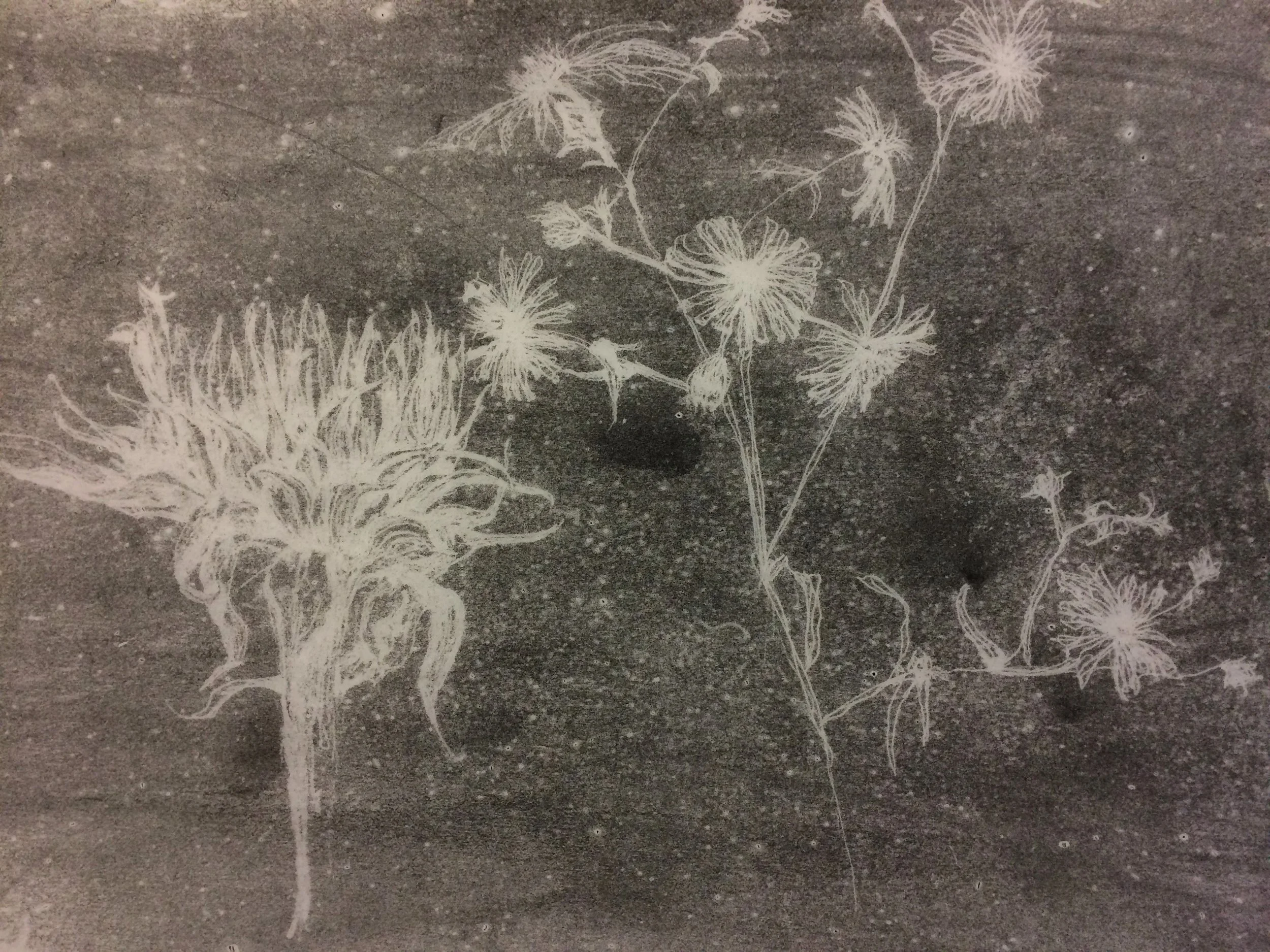 Lucy’s drawing practice derives from an acute awareness of being a participant in the environment and its development over time. Global ecological concerns currently present unfathomable issues seemingly beyond individual control. The long-term privileging of social, political and economic forces arguably results in mis-managing the land and the processes that sustain it. My interpretations of the extended field of drawing and participatory art practices provide me with useful tools with which to explore the current decline in insect populations. On occasion my three-dimensional Drawings create a spatial immersion that is all-encompassing. For example, when the drawn lines join with climbing ropes, breaking free from the page to take flight and reach between the walls. Such artistic outputs stand as opportunities for sensorial re-connection to the natural phenomena that we have problematically been taking for granted. The serendipity of nature is reflected in the unpredictable and imprecise lines of monoprints and etchings. Curiosity and the desire to understand my surroundings drives meticulous graphite, charcoal and chalk mark-making. I share this investigative process through collaborative drawing activities. Encouraging the audience to participate in making artworks in response to the environment, she hope to access a place of mutual understanding and interest. With this is mind, my ongoing practice-based research will continue to explore relations between people and the natural world.