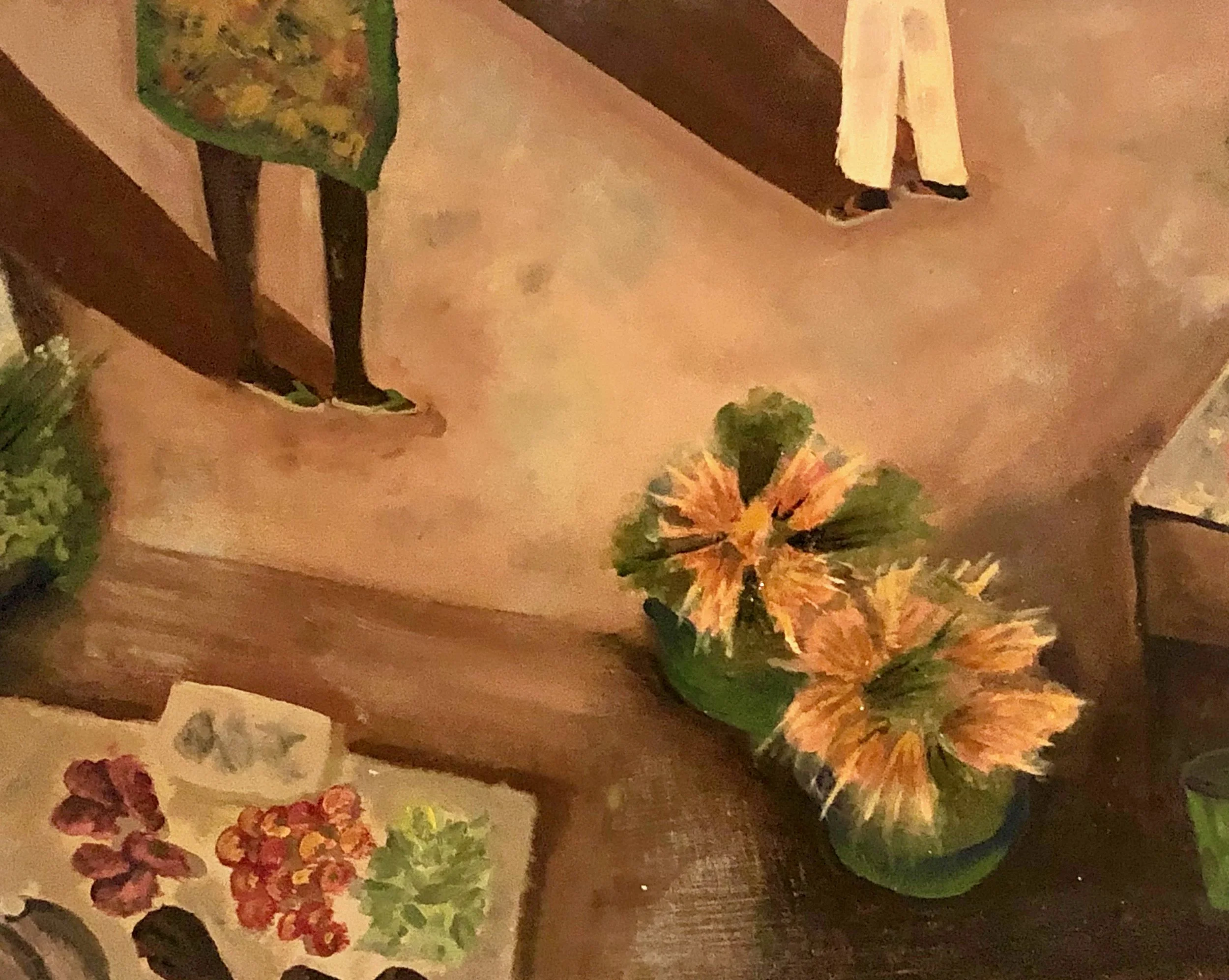 For this theme but also more in general, my art work is inspired by moments and scenes I capture in photographs and then let these images roam and develop in my mind. Once the subjects and ideas become more defined, I dive in and lay the first strokes or draw the first lines, the picture itself becomes only a far and vague memory … the painting or drawing becomes a personal representation of that moment or scene or person. For the paintings for this exhibition, I use oil paints made myself using natural pigments and walnut oil, natural impasto and I paint on wooden boards. For the drawings I use chalks, watercolour and inks. I sometimes also use collage.